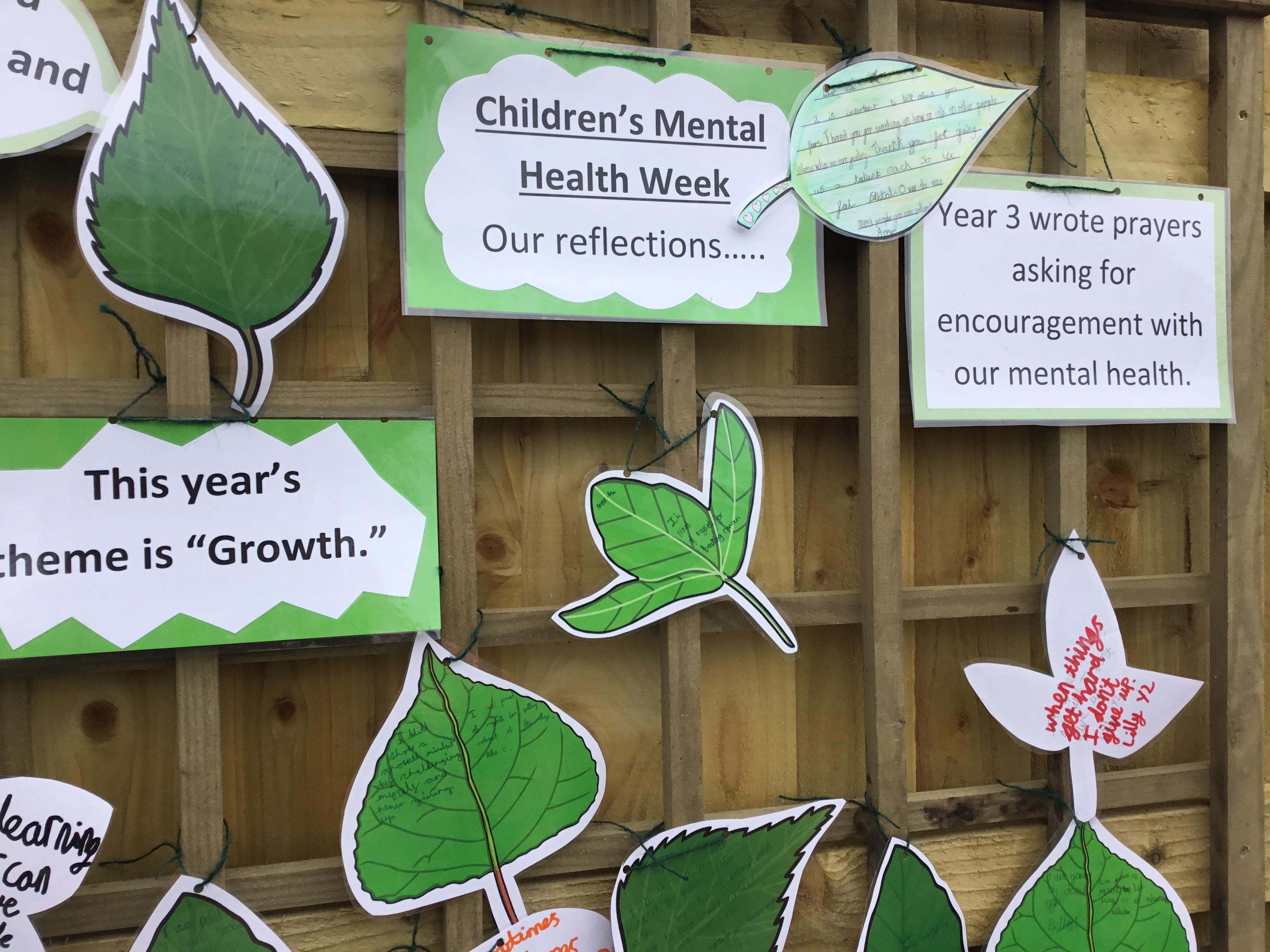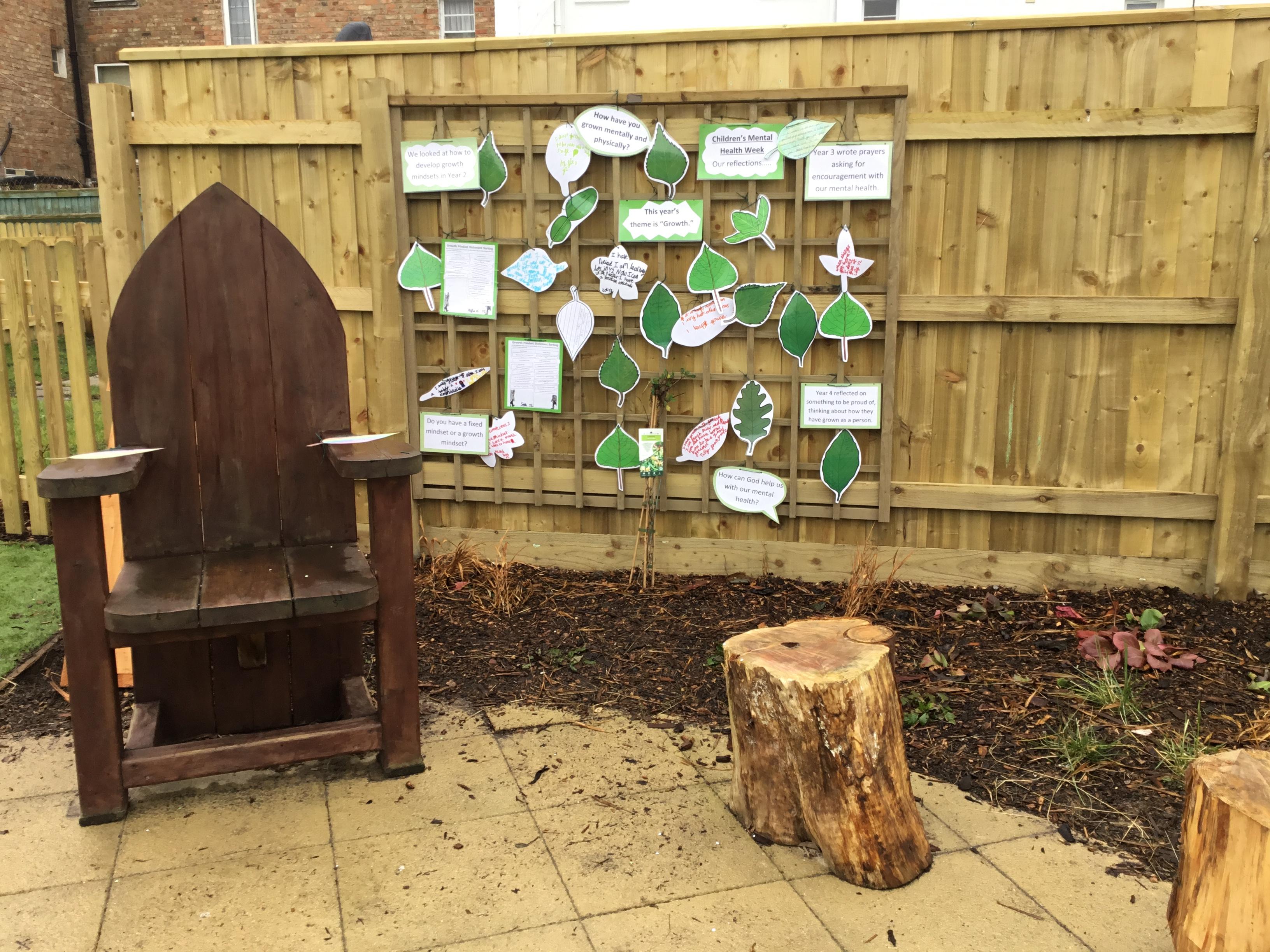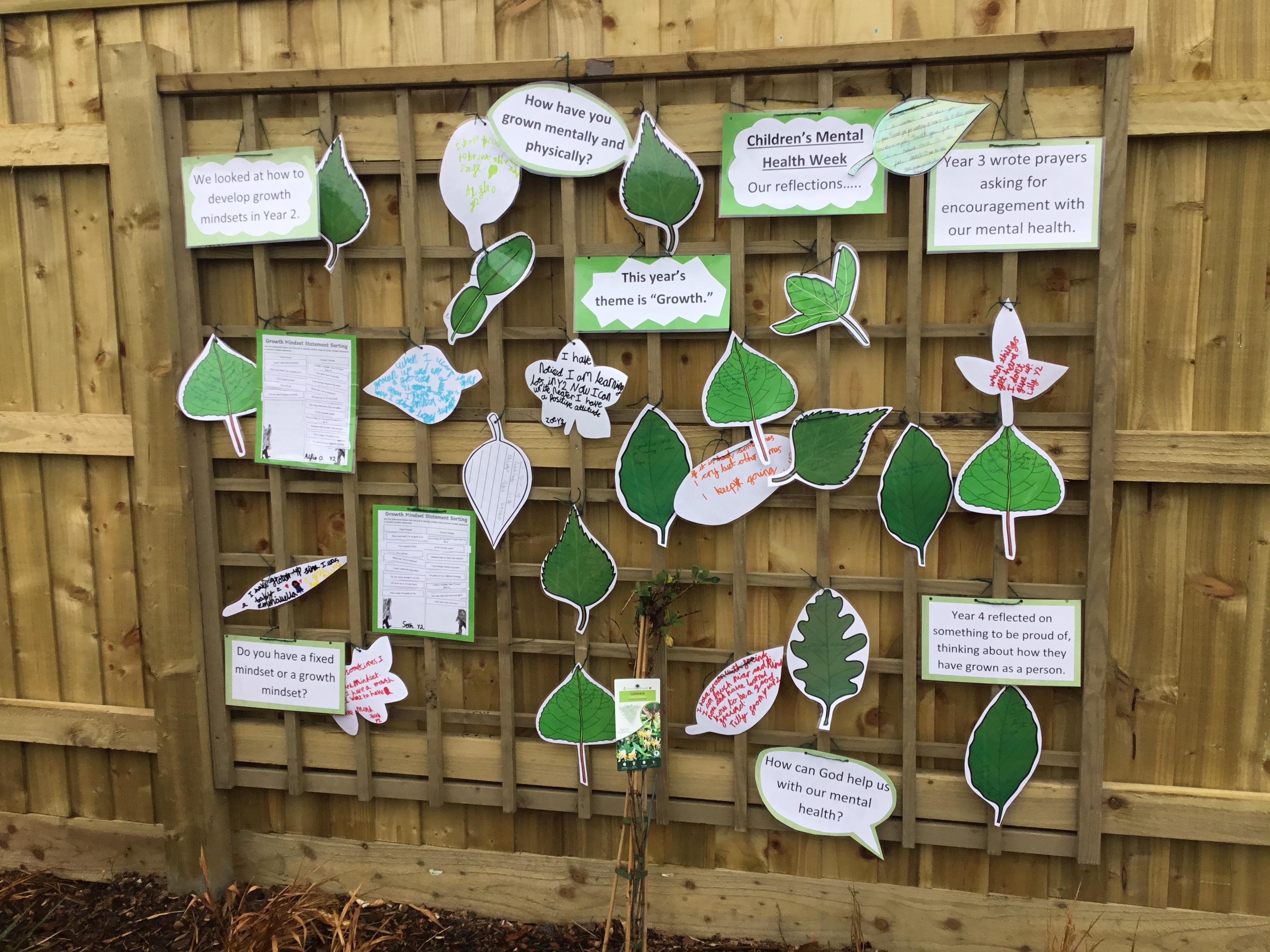 We have a new Spiritual Garden space where we can sit and reflect. This latest display shows our reflections on Children's Mental Health Week. Children reflected on how they have grown as a person, thought about their own mental health and wrote prayers asking God for encouragement.