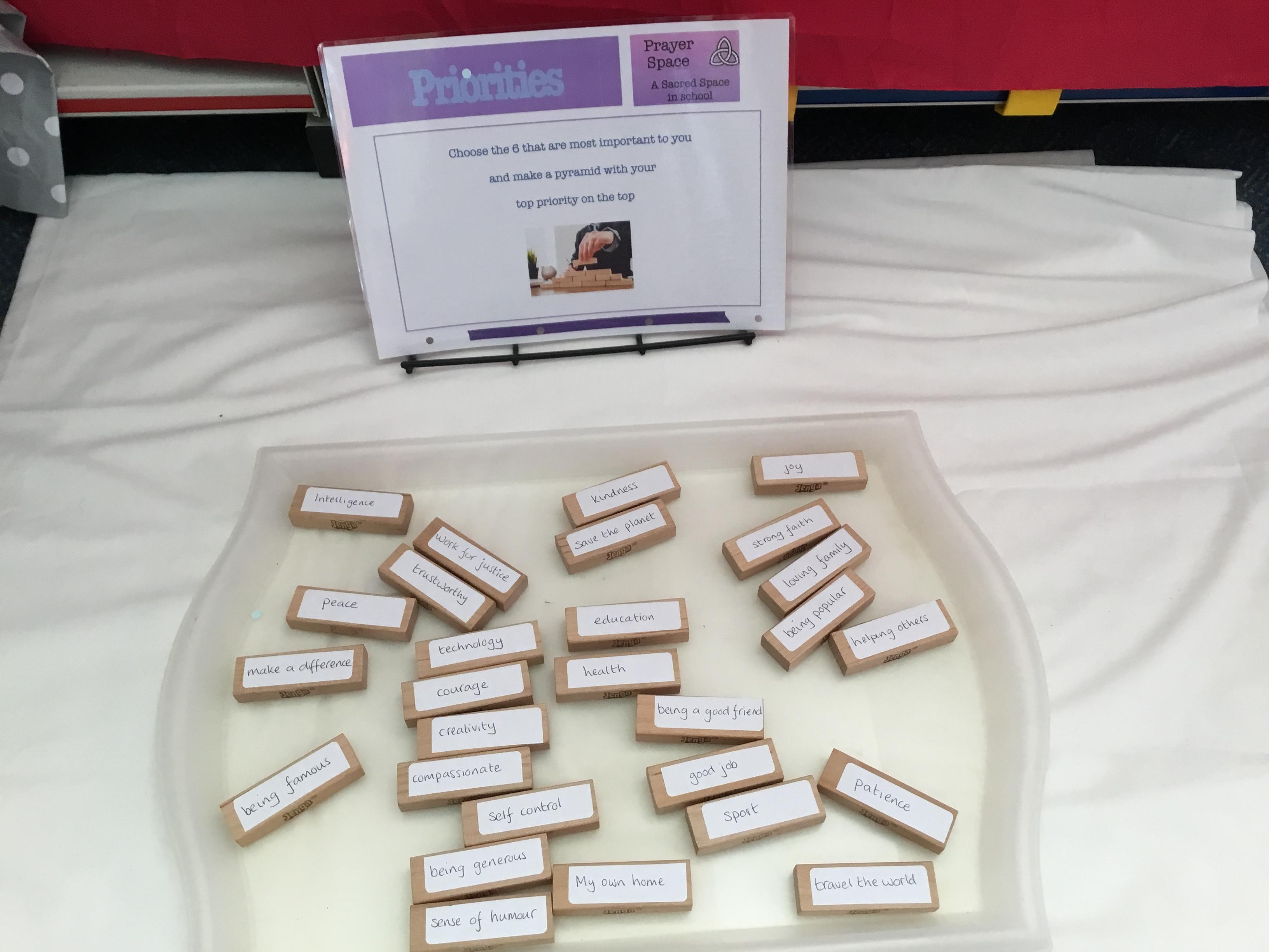 Each year we host a "Prayer Space" where pupils can visit and interact in creative, reflective activities linked different concepts for example forgiveness, me and others, God, social justice, me and the world. There are usually at least 10 stations they can visit. Pupils, staff and parents can visit and feedback is always wonderful.