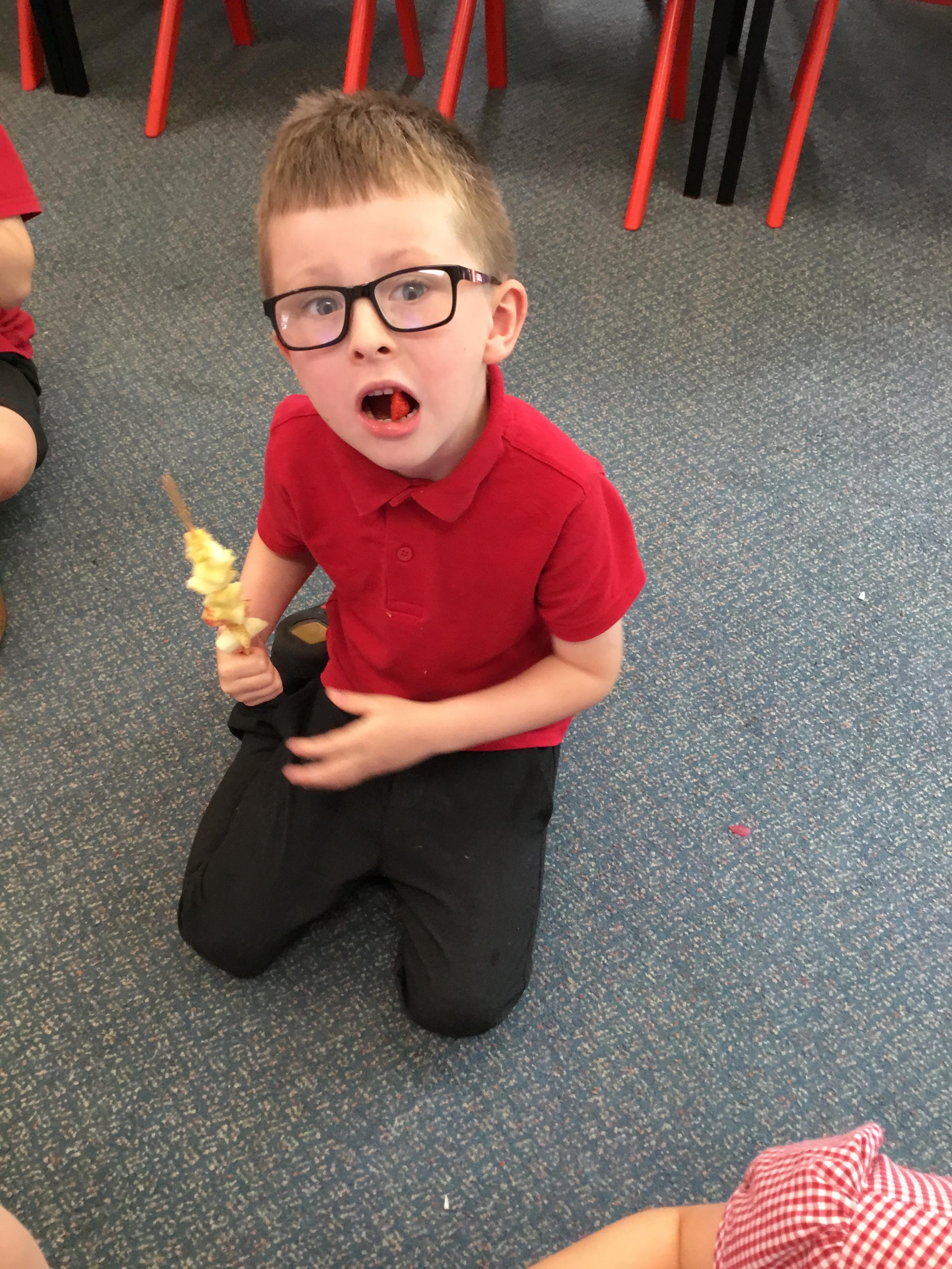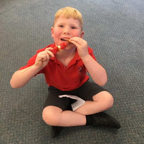 Fruit Kebabs - Today (2.7.21) we enjoyed making and eating fruit kebabs as part of our Design and Technology topic. We used a knife to cut out fruit and carefully washed up the equipment we used. They were YUMMY!